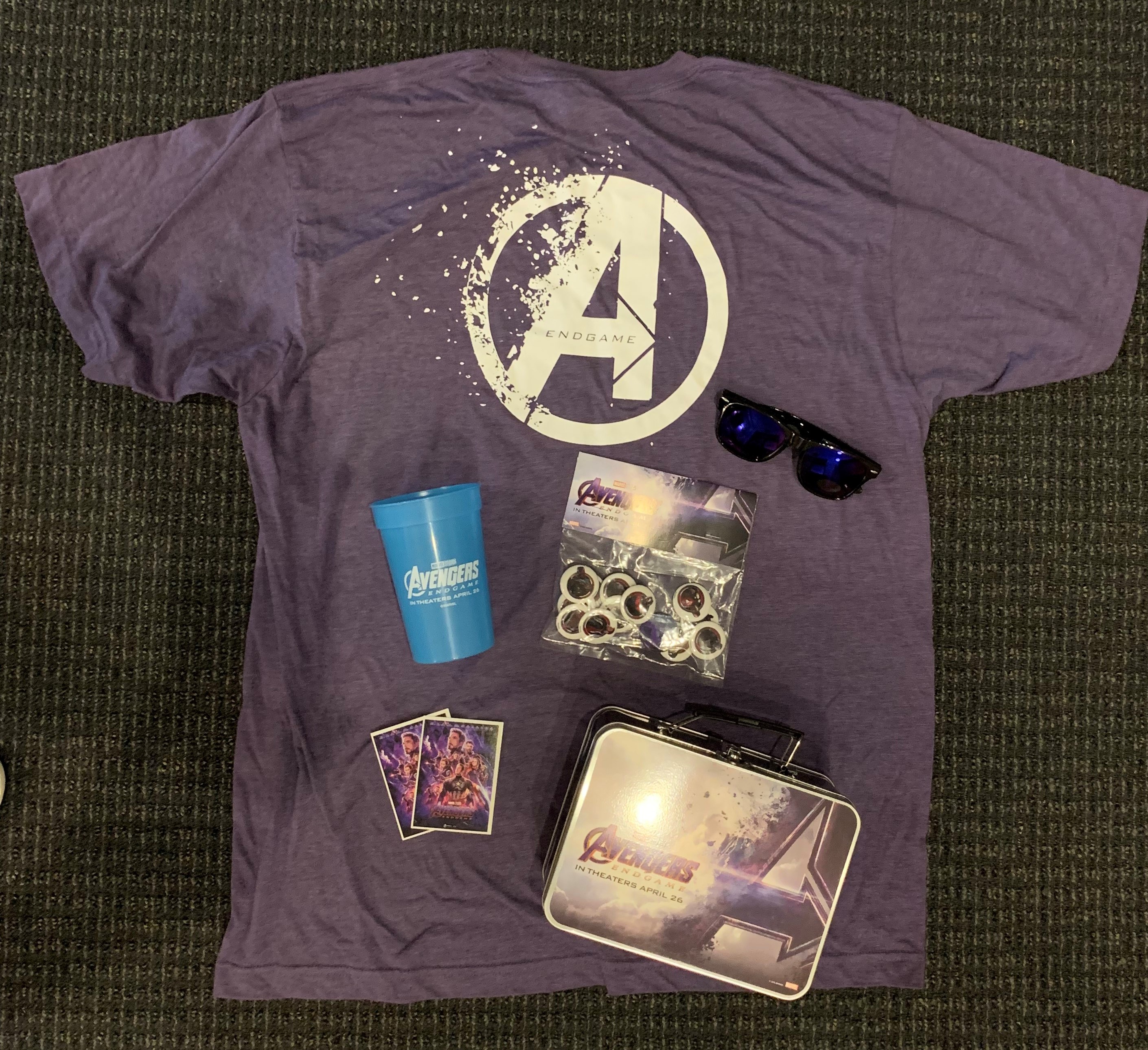 The prize pack includes a t-shirt, sunglasses, pins, a lunchbox and cup, and a pair of tickets to see Avengers Endgame.