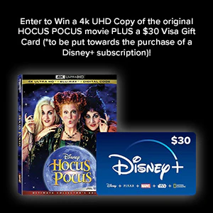 Enter now to win One (1) 4k UHD Copy of the original HOCUS POCUS movie PLUS one (1) $30 Visa Gift Card (*to be put towards the purchase of a Disney+ subscription)!